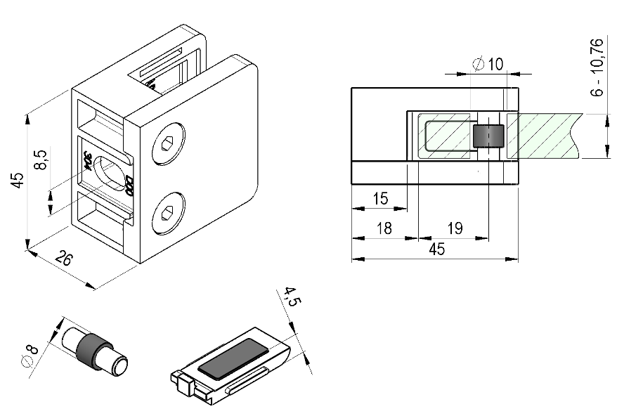 Rohový nerezový držák (úchyt) skla (tabulové výplně), určeno pro uchycení na rovný povrch (např. jeklový sloupek či zeď).