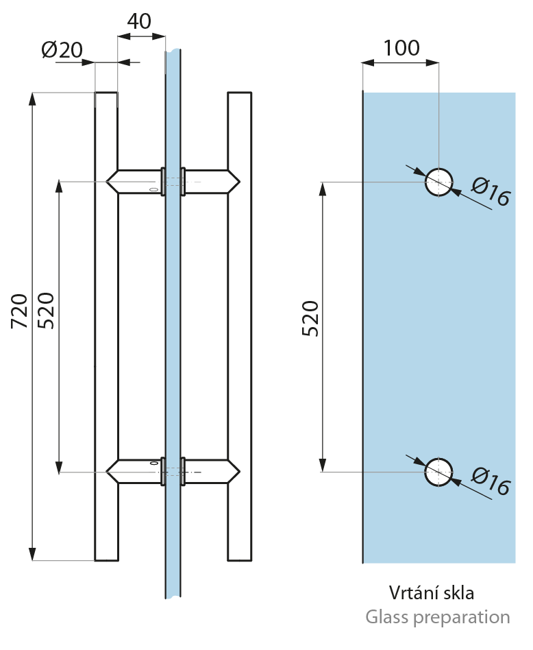Párové nerezové madlo na celoskleněné/dřevěné dveře, úchopová část o Ø 20 mm v délce 720mm, rozteč 520mm. (včetně montážního příslušenství)