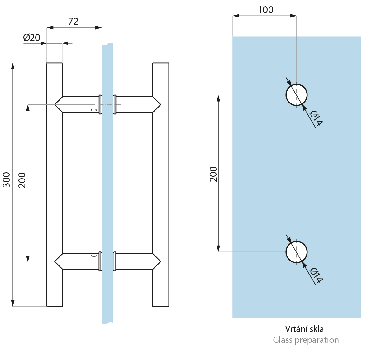 Vrtání skla (Glass preparation): 2x Ø14mm