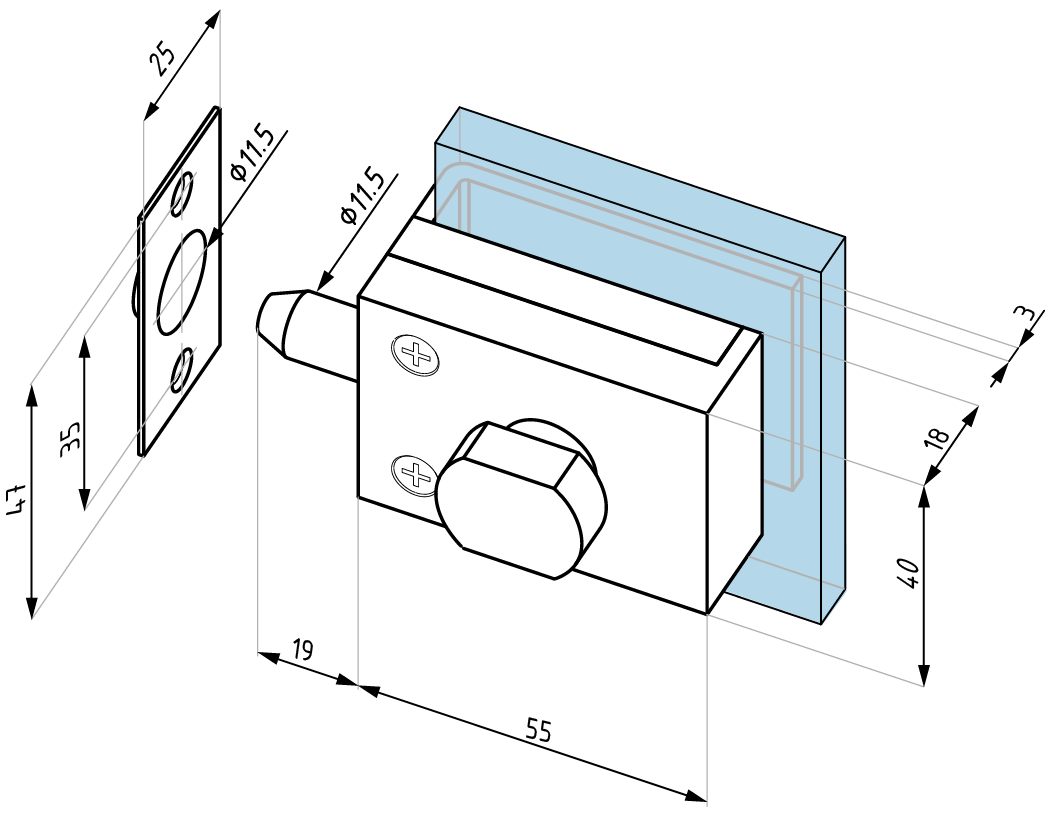 Zámek s motýlkem a protikusem na zeď (destičkou) pro skleněná dveřní křídla. Svorné uchycení, bez výřezu ve skle.