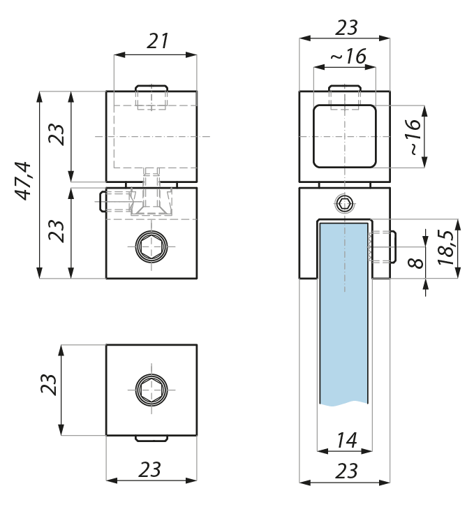 Koncová spojka tyč-sklo (sklo nemusí být vůči tyči kolmé, koncovka je stavitelná) / End connector glass to square bar