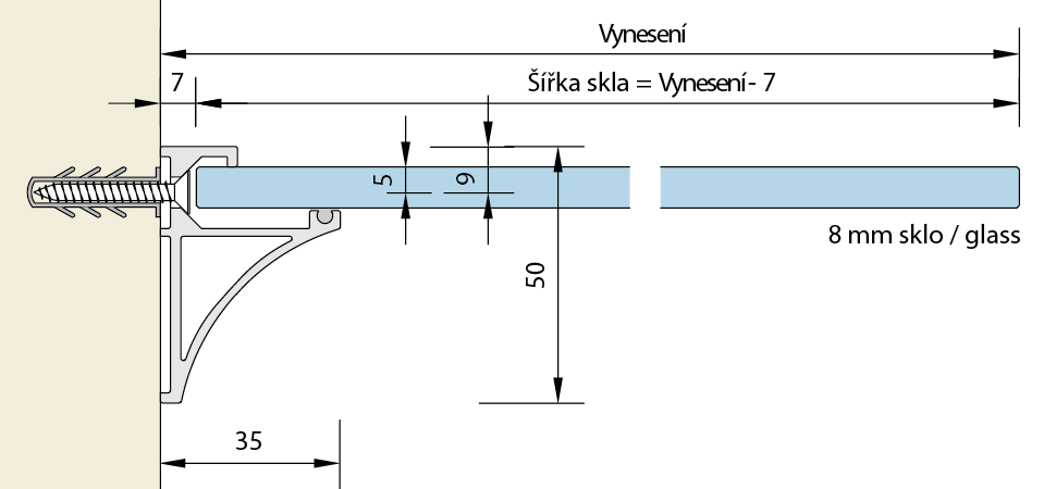Hliníkový profil pro uchycení skleněných polic o tloušťce skla 8 mm. Balení zahrnuje profil, čiré těsnění. Maximální dodávaná délka 3000 mm.