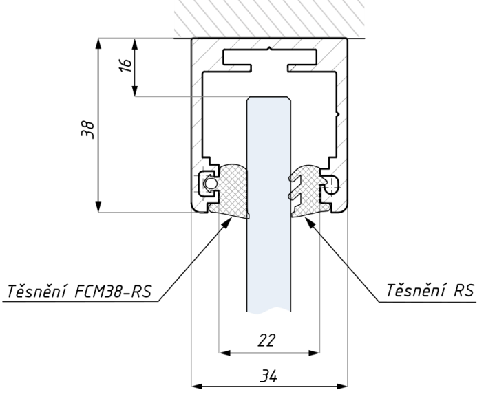Zasklívací montážní U-profil pro fixní skla FCM38-TOP. Těsnění na sklo 10-10,76/12-12,76mm se objednává samostatně
