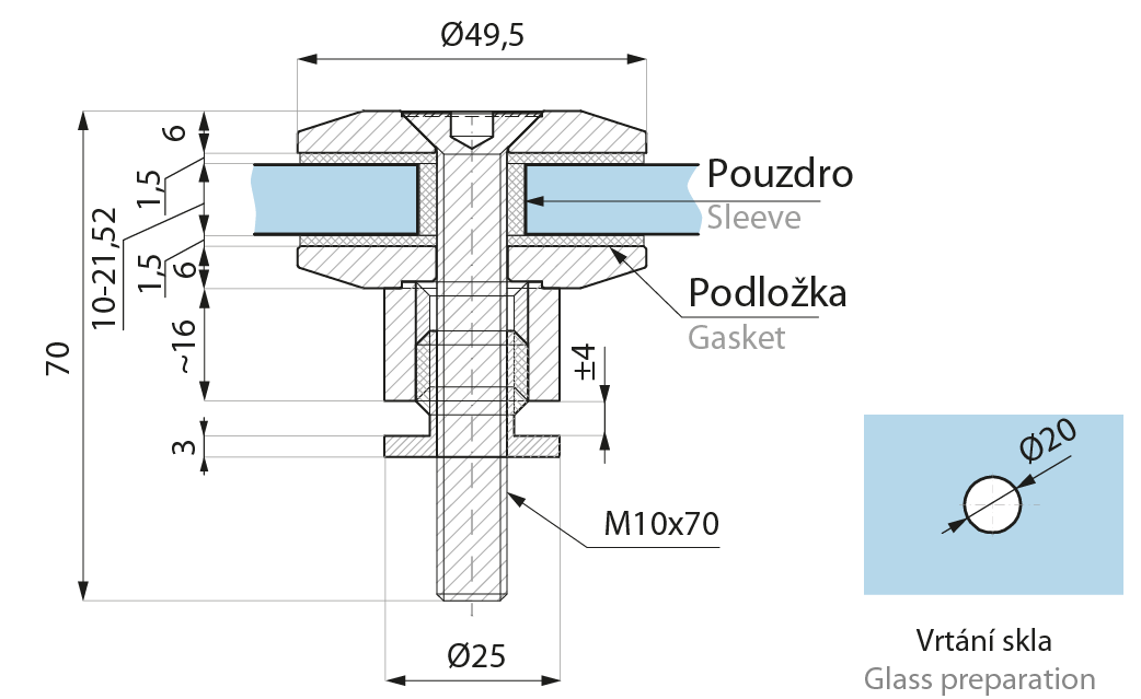 Kotevní bod pro celoskleněné zábradlí s regulovatelnou distancí / Point stud with adjustable standoff
