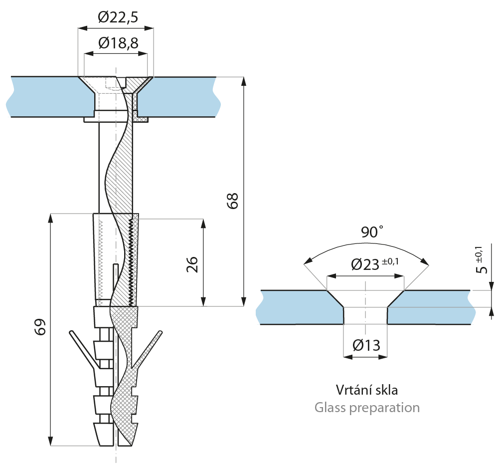 Bodový úchyt MPE10 se zápustnou hlavou a hmoždinkou