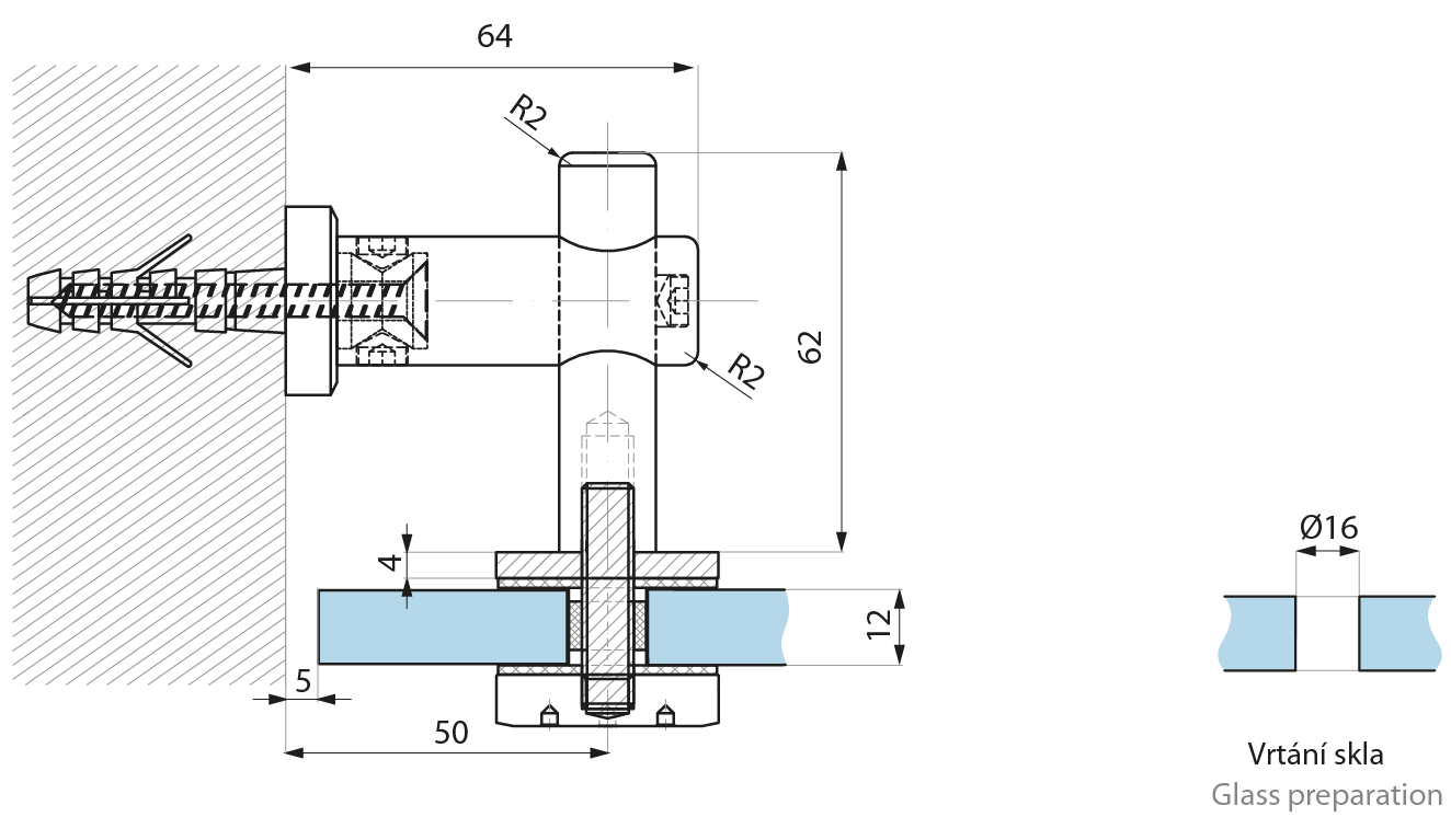 Bodový úchyt (zeď - sklo) MCN1-FQ pro skla síly 8-12,76mm