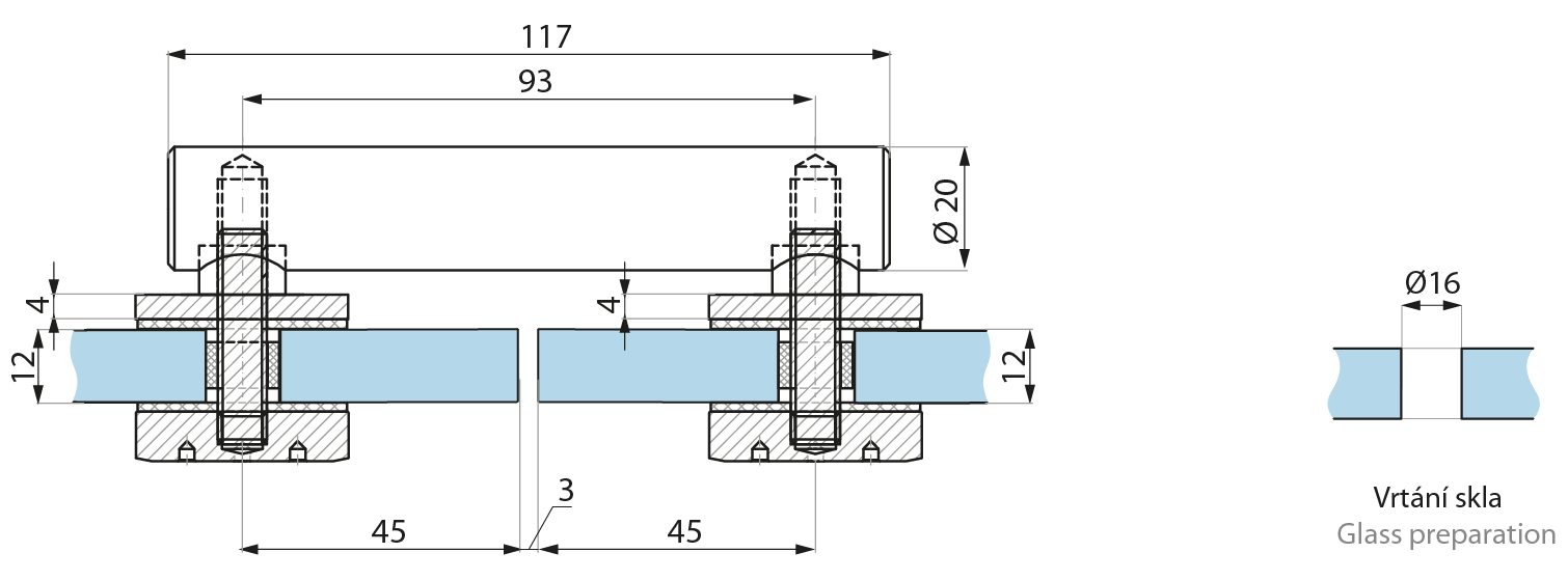Bodový úchyt (sklo - sklo 180°) MCN2-FQ pro skla síly 8-12,76mm