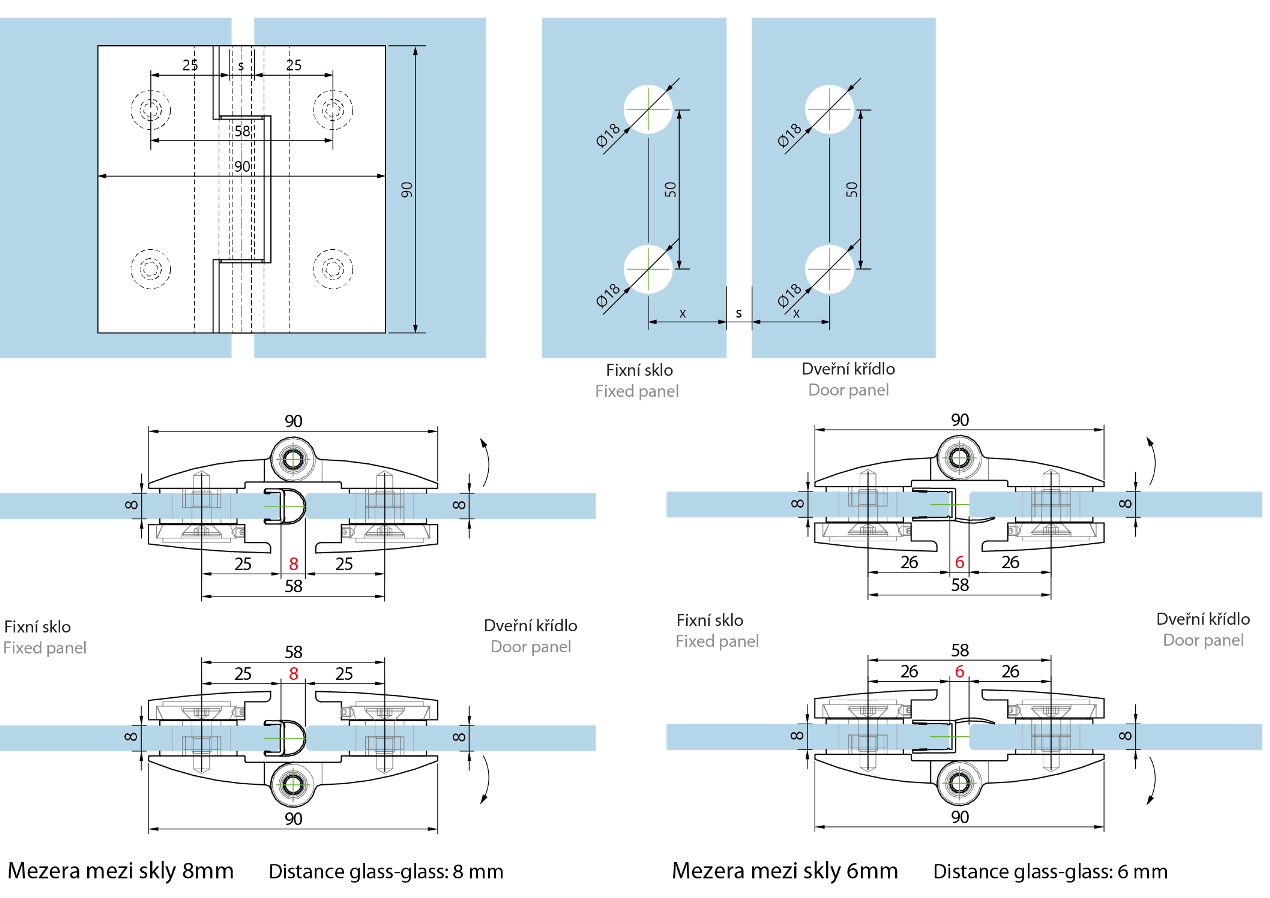 Pravo-levý pant sklo-sklo 180°, umožňující maximální otevření, tedy plných 180°