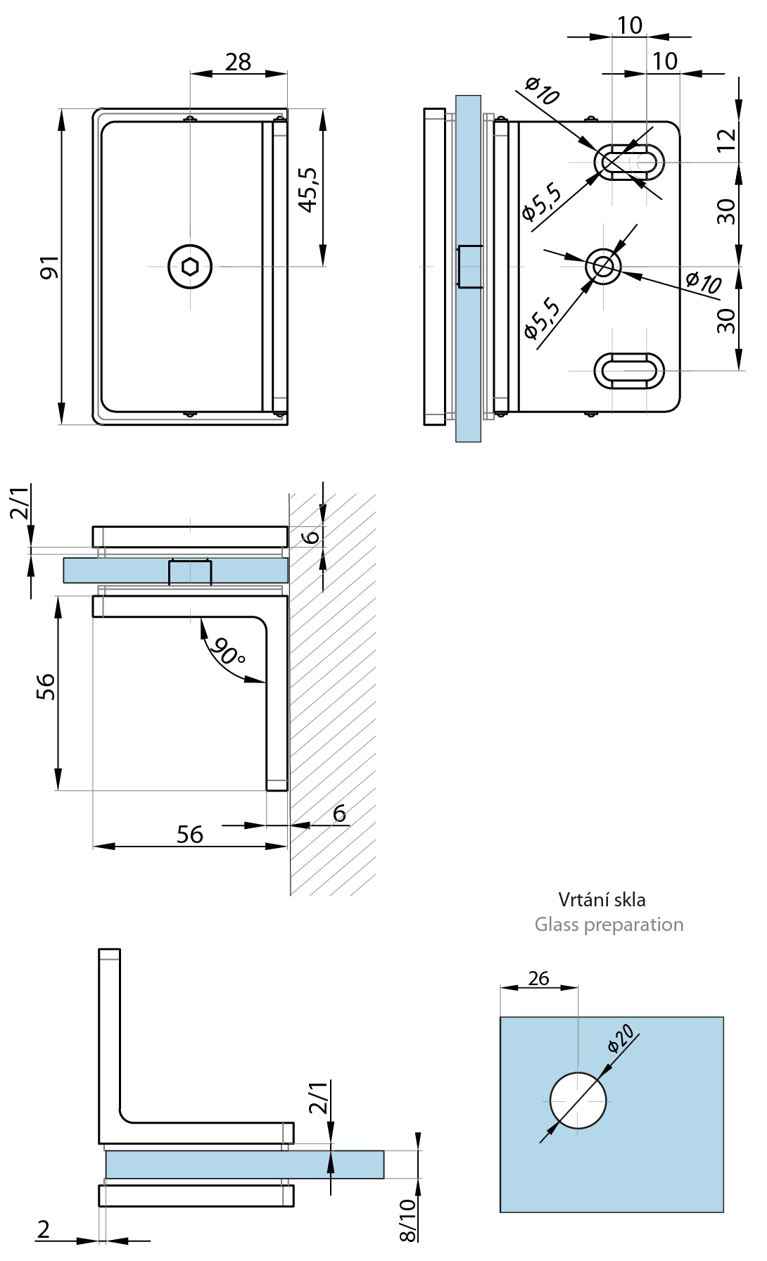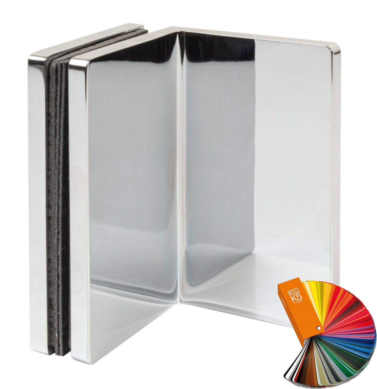 M80C90 spojka sklo-zeď    Spojka sklo-zeď, skryté šrouby (Standard clamp glass to wall 90°)   Pro sílu skla (For glass thickness): 8/10 mm   Typ povrchu RAL - jemná struktura matt/ hladká matt (zvolte výše)   / Type of surface - structure matt / smooth matt  (Choose a surface finish above) RAL= uveď... celý popis