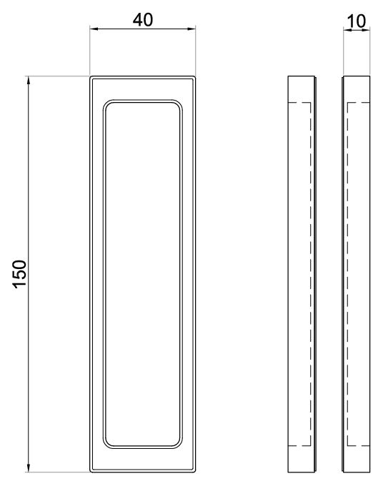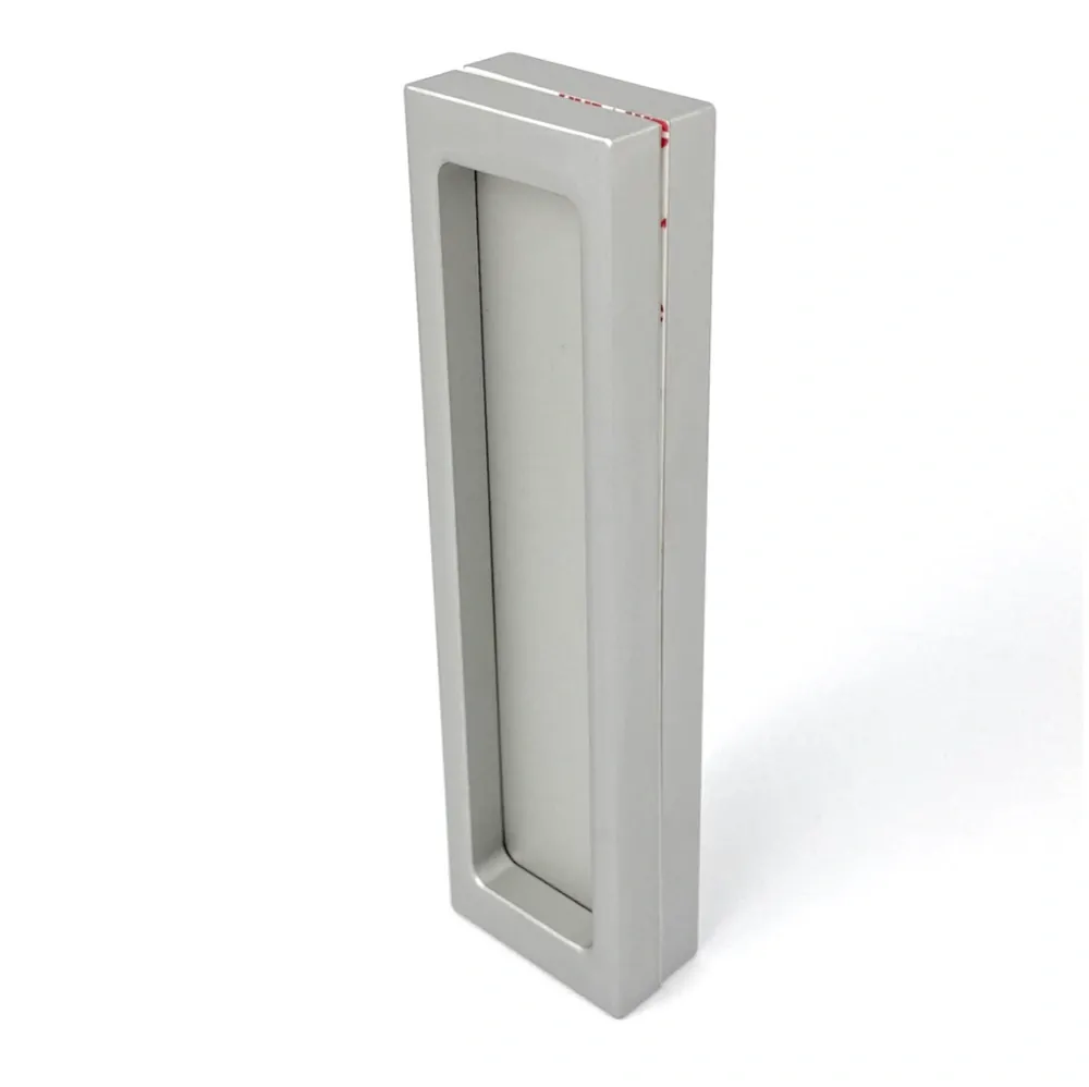 Hliníkové hranaté madlo (mušle) o rozměrech 150x38 mm na skleněné posuvné dveře. Určené k lepení (obsaženo v balení).
