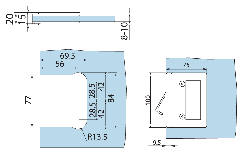 Párový úchyt (mušle) Metalglas V-406-R o rozměrech 100x745mm na skleněné posuvné dveře s tloušťkou skla 8/10/12 mm.