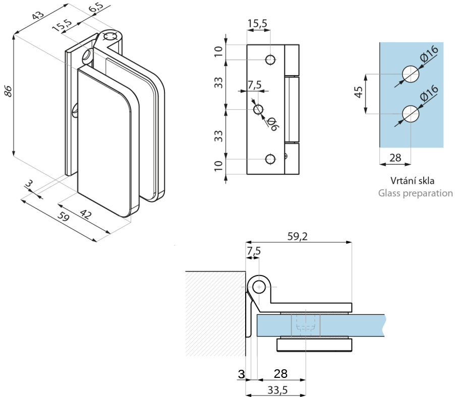 Závěs s montážní destičkou pro tloušťku skla 8/10/12mm.