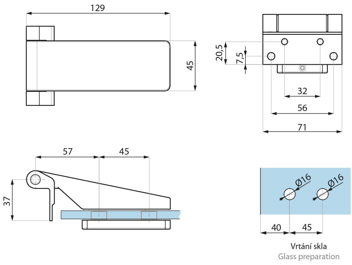 Pant pro dveře do zárubněs montážní destičkou, pro tloušťku skla 8/10mm. Nosnost 50 kg / pár