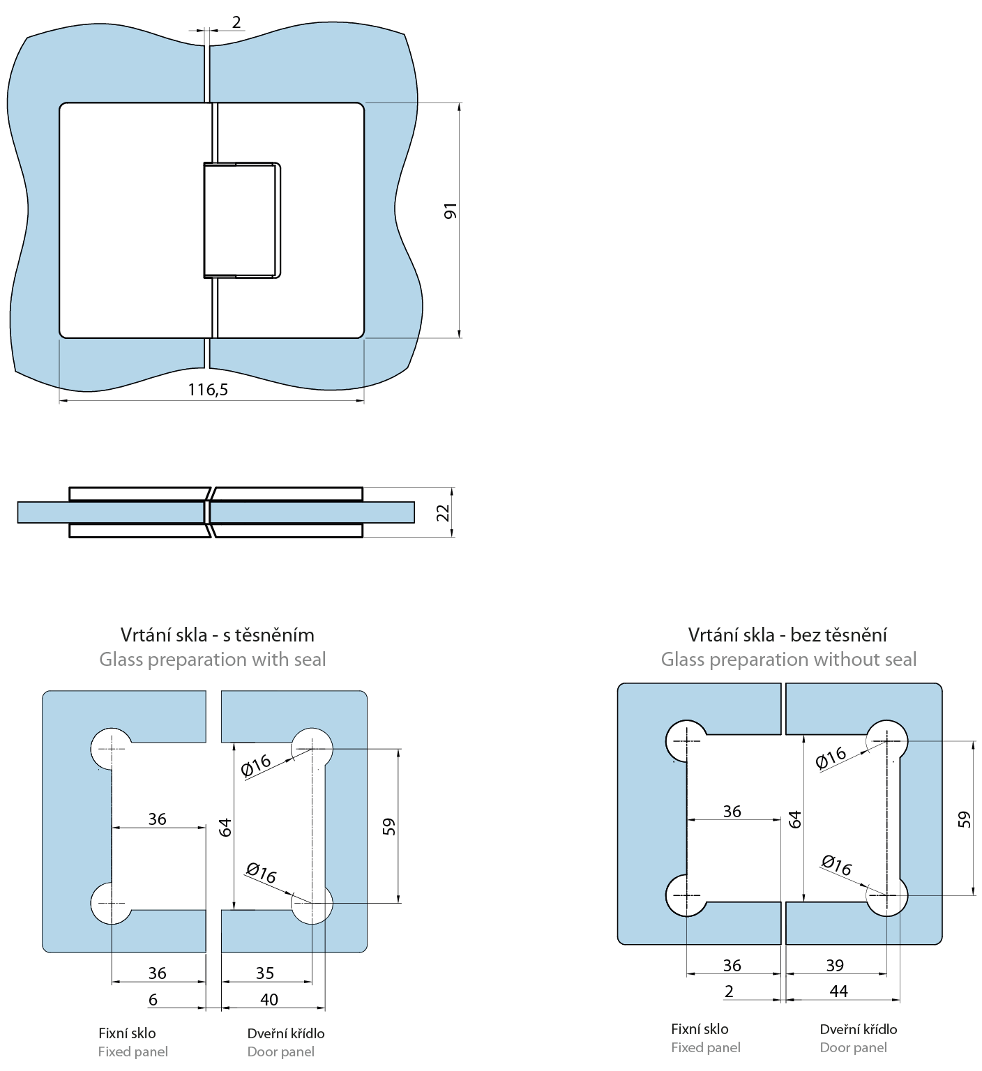 Závěsy s oboustranným otevíráním, se samozavíracím pružinovým mechanismem v rozsahu 0° - 25° a s regulací nulové polohy ± 10°, skryté montážní šrouby.