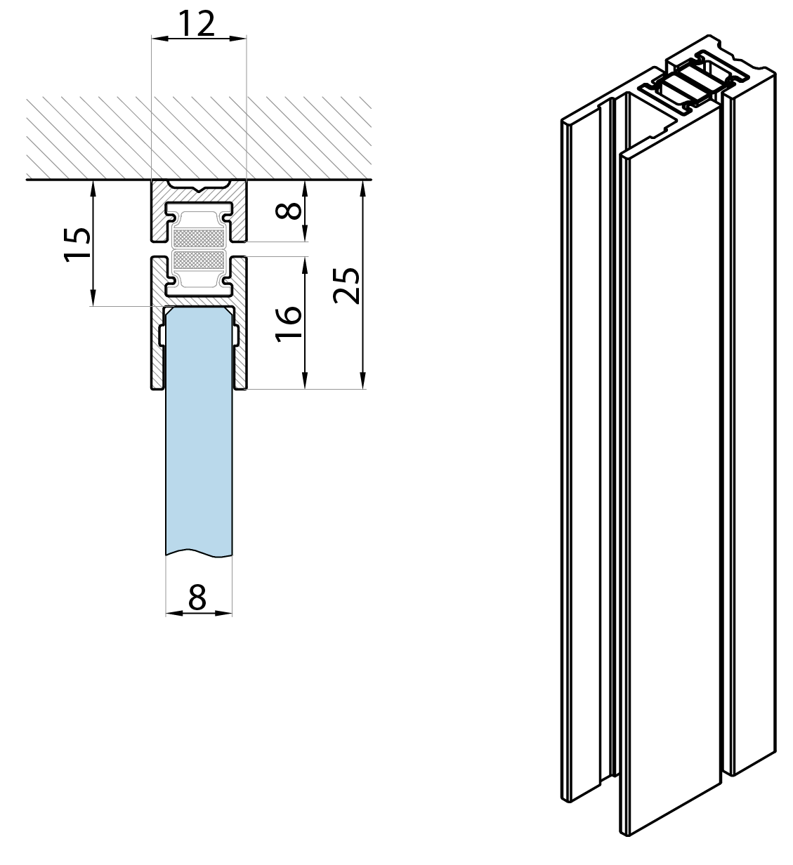 Lištové magnetické těsnění pro úhel 180° sklo-zeď/sklo-sklo pro posuvné sprchové kouty, pro sílu skla 8mm. Aplikace nalepením např.silikonem, není součástí dodávky.