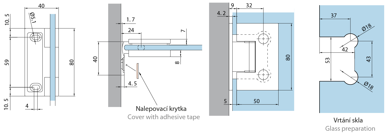 Závěsy s oboustranným otevíráním, se samozavíracím pružinovým mechanismem v rozsahu 0° - 40° a s regulací nulové polohy ± 10°, skryté šrouby.