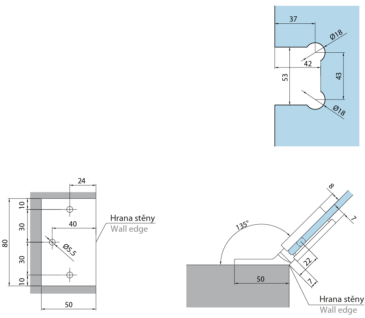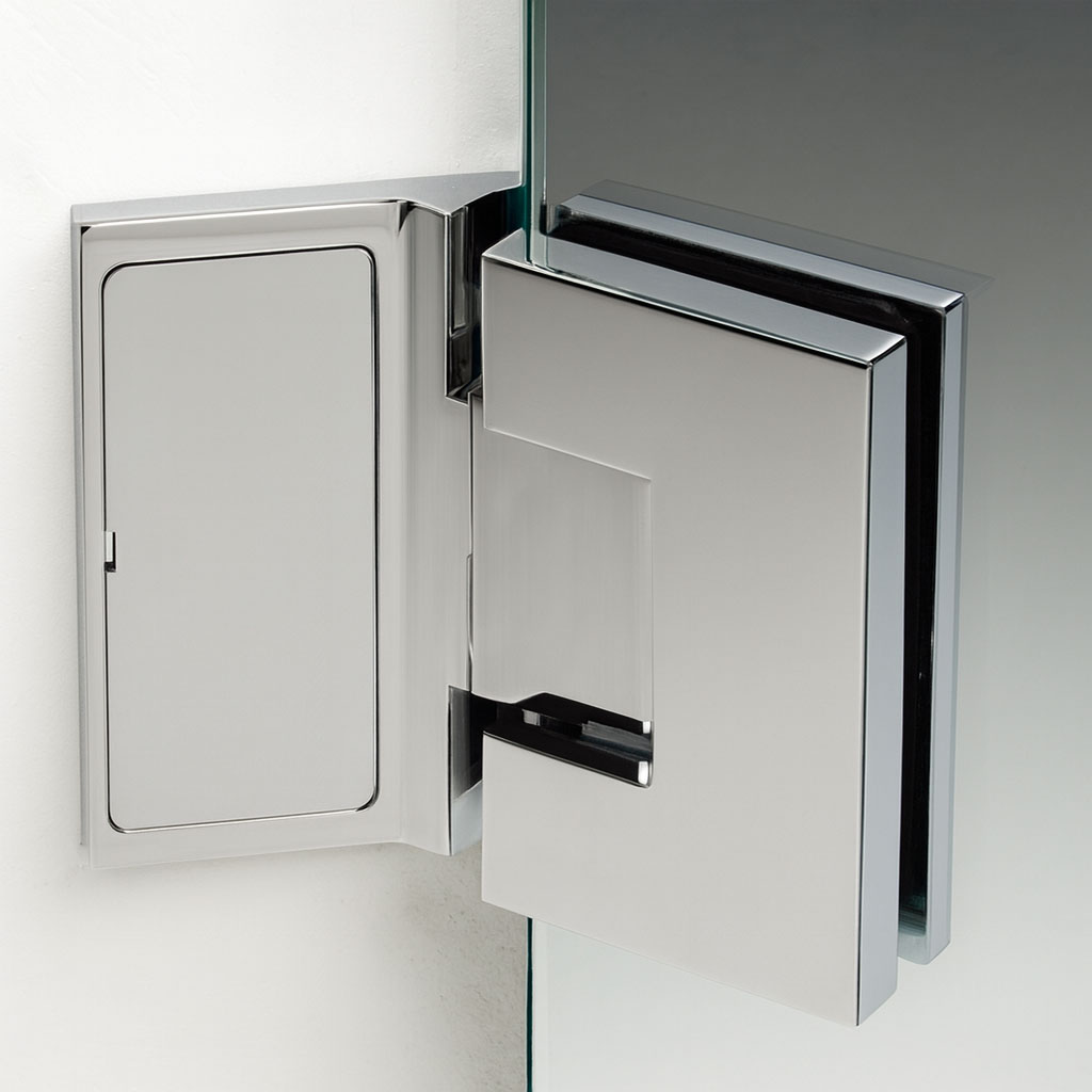 (Hinges glass to wall 135° with the self-closing spring mechanism from 30° to 0° and the angle adjustment ±10° in the closing position)