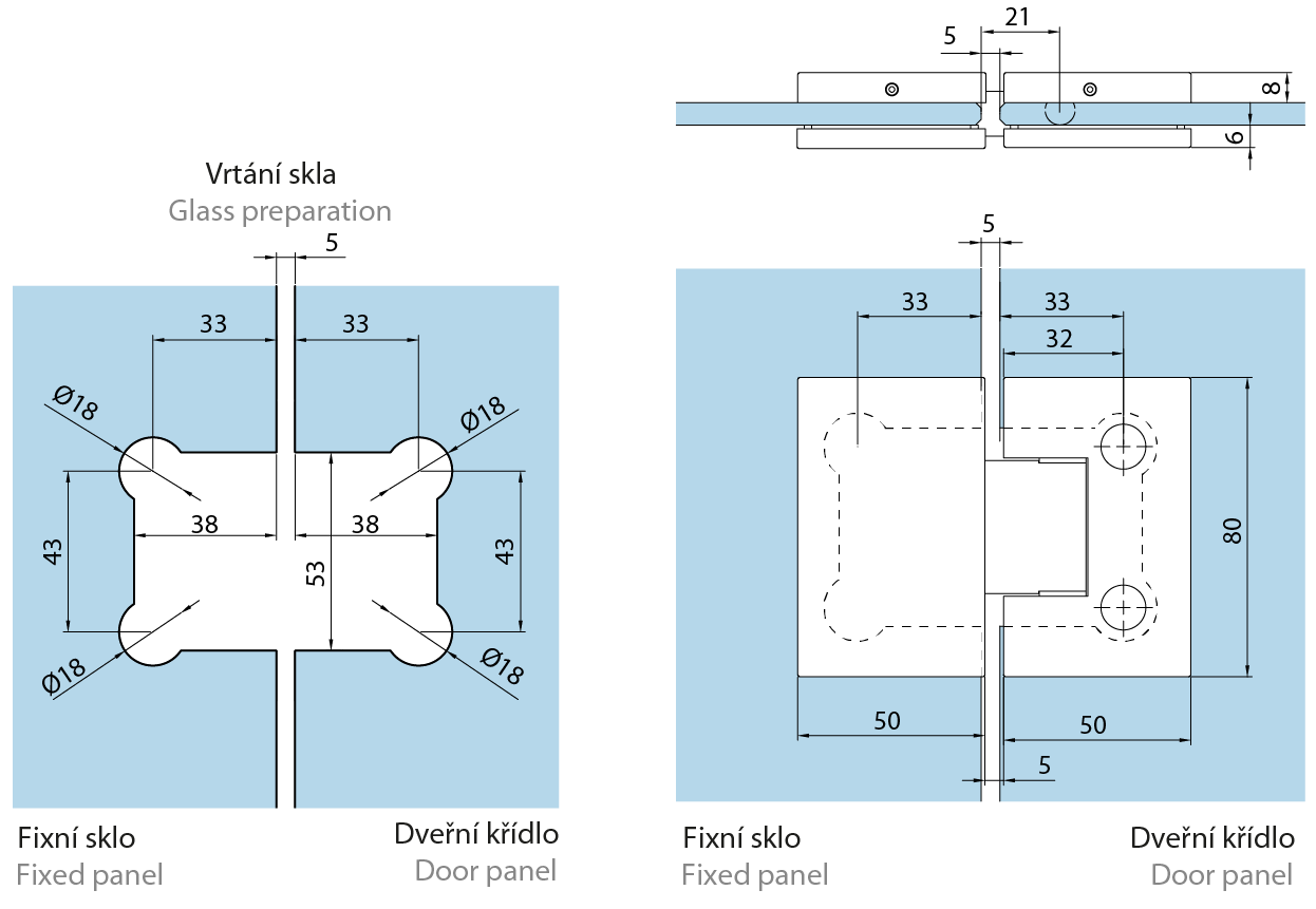 Závěsy sklo-sklo s oboustranným otevíráním, se samozavíracím pružinovým mechanismem v rozsahu 0° - 30° a s regulací nulové polohy ± 10°.