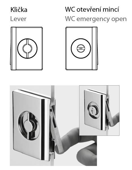 Zámek s kličkou k otevírání/zamykání, z druhé strany drážka pro nouzové otevření (šroubovákem/mincí), protikus na zeď je součástí