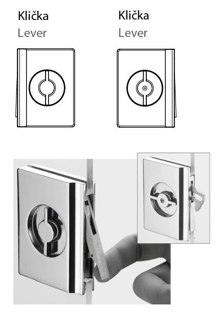 Určeno pro posuvné skleněné dveře a dveře do pouzdra, úchyt disponuje výklopnou páčkou a možností zamknutí