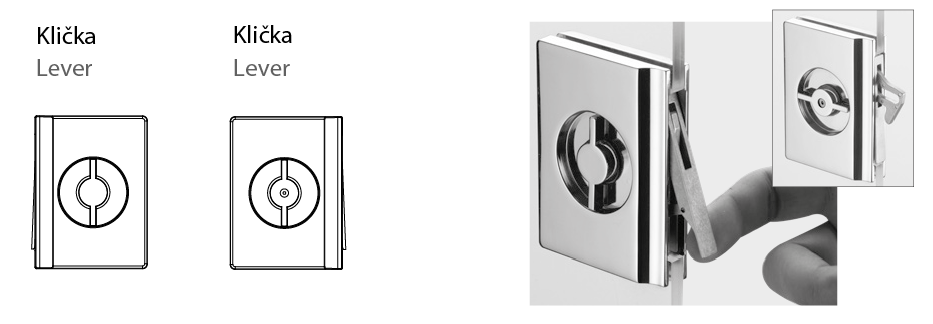 Určeno pro posuvné skleněné dveře do pouzdra, úchyt disponuje zasunovací páčkou a možností zamknutí