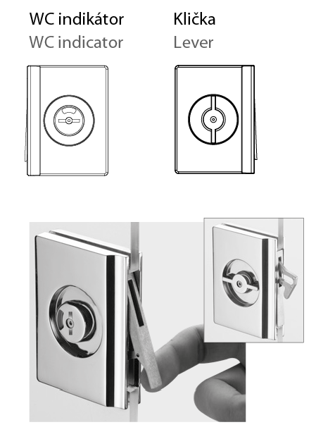 Zámek s kličkou k otevírání/zamykání, z druhé strany barevný indikátor (OBSAZENO), protikus na zeď je součástí